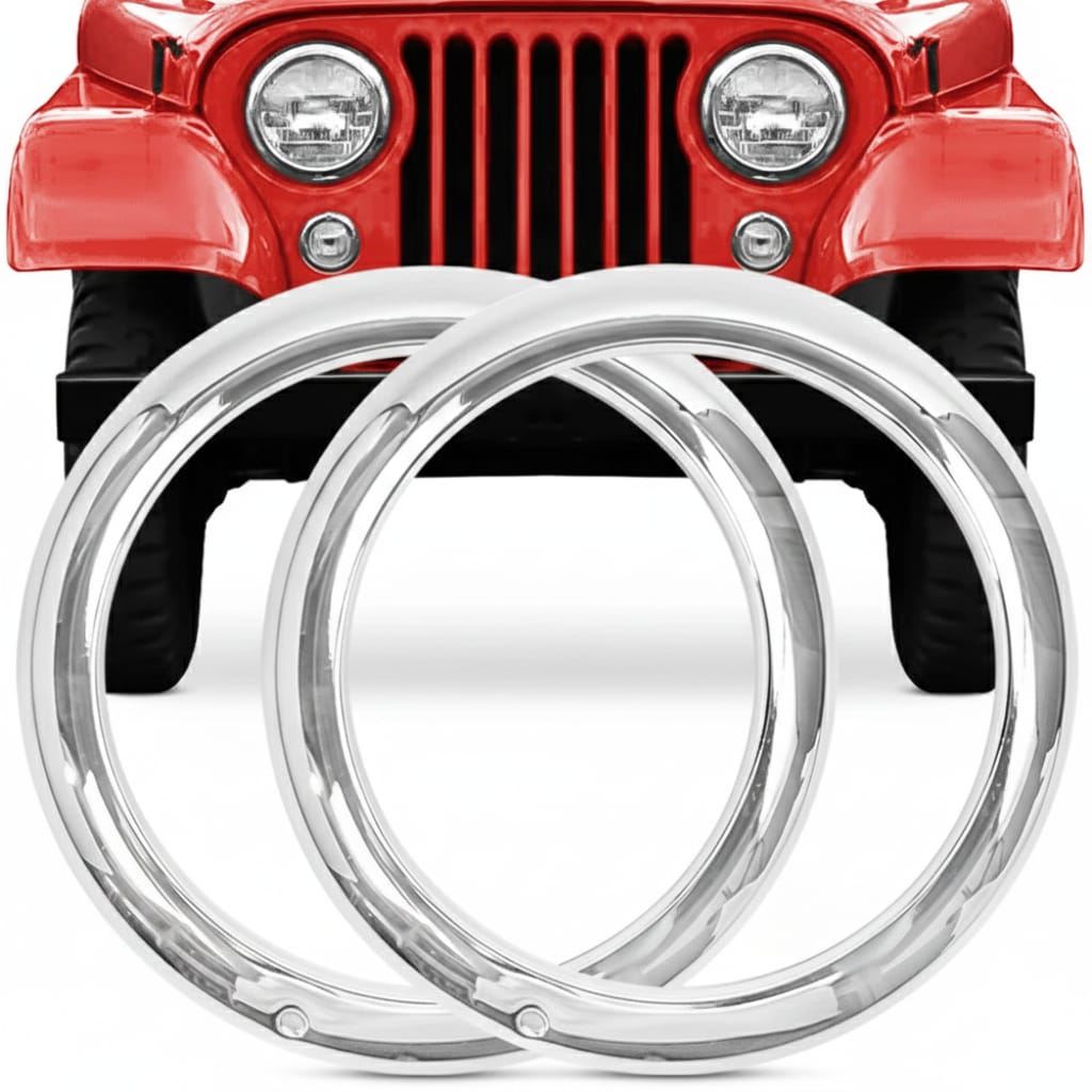 Aro de farol cromado de alta qualidade paraJeep Willys CJ5(1955 a 1983), compatível também com Rural e F-75.Ideal para restauração ou personalização, oferece acabamento brilhante, durabilidade e encaixe perfeito para o visual clássico do jipe.