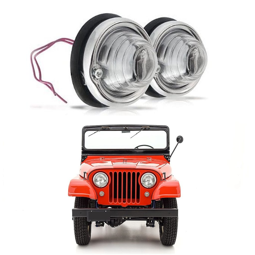 Lanterna pisca dianteira para Jeep Willys CJ5 e Ford (após 1966), compatível também com CJ3. Modelo de reposição com lentes em acrílico (cristal) e carcaça metálica ou plástica, ideal para restauração. Disponível em tamanho g pequeno (aprox. 6-7 cm), geralmente com lâmpada de 2 polos (12V).